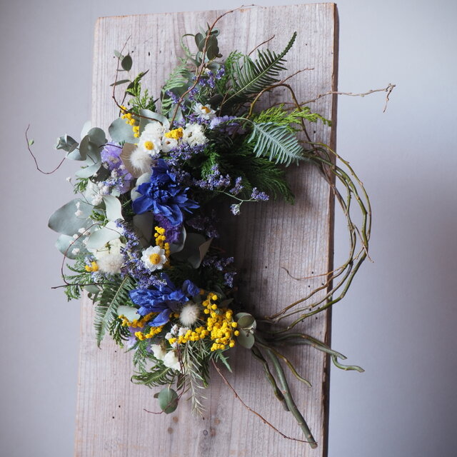 雲竜柳を丸めてベースにし、香川県産のユーカリや可憐な小花を、空気を含ませながらふんわりと紡いで、春風が通り抜けたかのような軽やかな立体感を表現しました。