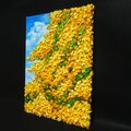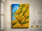 特に注目すべきは、絵具の重なり(インパスト)が生み出す美しいテクスチャです。鮮やかな青空と立体的に表現されたイエローのコントラストは、見る角度や照明によって変化し、飽きることがありません。この作品をお部屋に飾ることで、自分を癒やすリビングや大切な方への「幸せの贈り物」として、心地よいリズムが流れます。