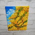 「風とはずむミモザ」は、青空のもとで黄金色のミモザが優しく風に揺れる様子を描いた美しい油絵作品です。見るだけで心がリフレッシュされ、まるでその場にいるかのような感覚をもたらしてくれます。厚塗りの油彩が生み出す立体感は、写真では味わえないリアルな迫力を感じさせ、朝の光が当たれば、ミモザの花びらがさらなる輝きを放つことでしょう。