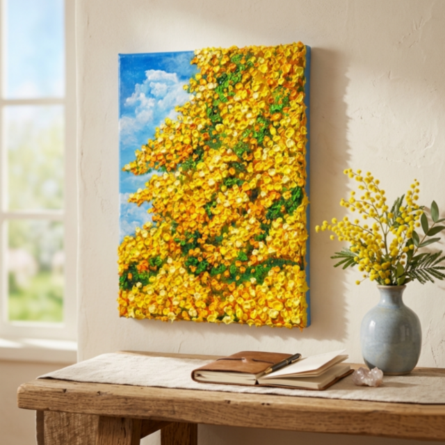 この「風とはずむミモザ」は、お客様の空間に明るいエネルギーをもたらし、日々の生活に彩りを添える素晴らしいアート作品です。