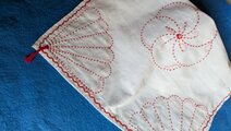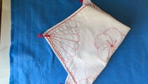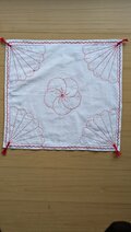 白い晒木綿の生地に、「扇とねじり梅」の模様を刺しました。
