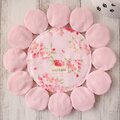 丸く裁断した布を1つずつ縫い縮めてお花のようにした、パッチワーク技法の一つ「ヨーヨーキルト」を、サークルマットに12個縫い付けてあります。