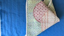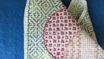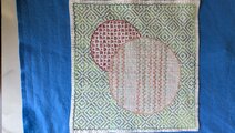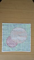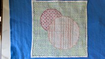 白い晒木綿の生地に、緑やエンジ系の糸で「まる二つ」に、一目刺しをしました。