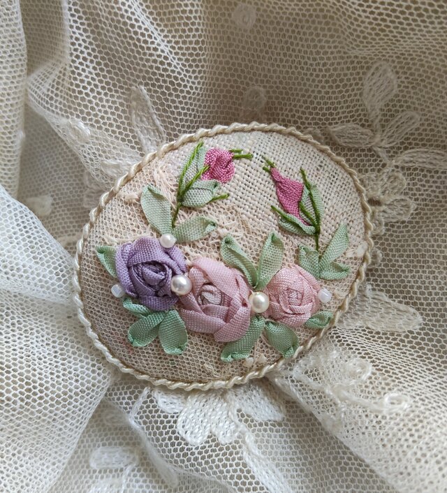 ちょっとくすんだアンティークな雰囲気のピンク系のシルクリボンを使っています。