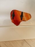 着物の帯留めを天然石(レッドアゲード・瑪瑙・メノウ)で作ってみました。オレンジ色や赤色の縞模様が特徴の鉱物です。