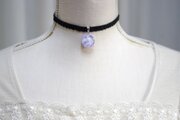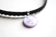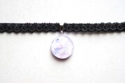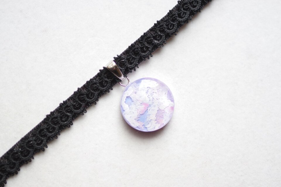 明け方のようにも黄昏のようにも見える、紫色にほのかにピンクが混じった雲に覆われた空を思わせるレジンを、ベルベットリボンにタティングレースで装飾を施したチョーカーに仕上げました。