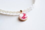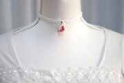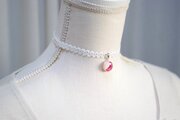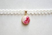 真珠色のレジンをピンク色で着色し、控えめにラメを乗せた、小粒ながらも可憐なレジンを、サテンリボンにタティングレースで装飾を施したチョーカーに仕上げました。