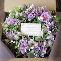 淡いパープルの花々を重ね、