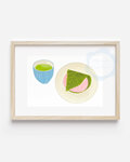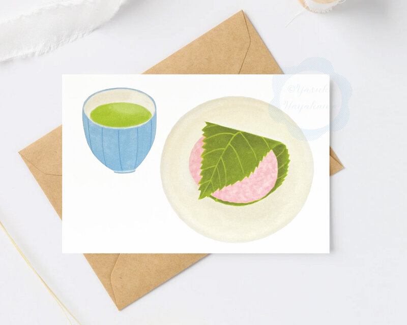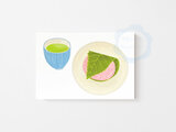 春の和菓子、桜餅と緑茶を水彩タッチで描きました