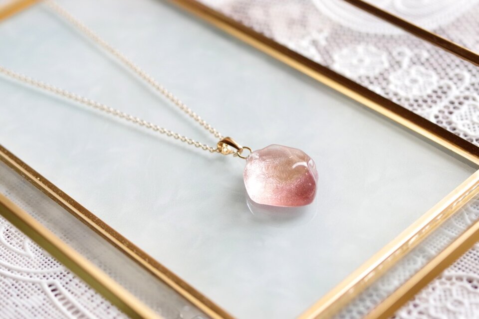 二種類のピンクが作る水面をのぞき込んだような、うららかなカラーリングが特徴のペンダント。