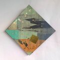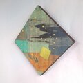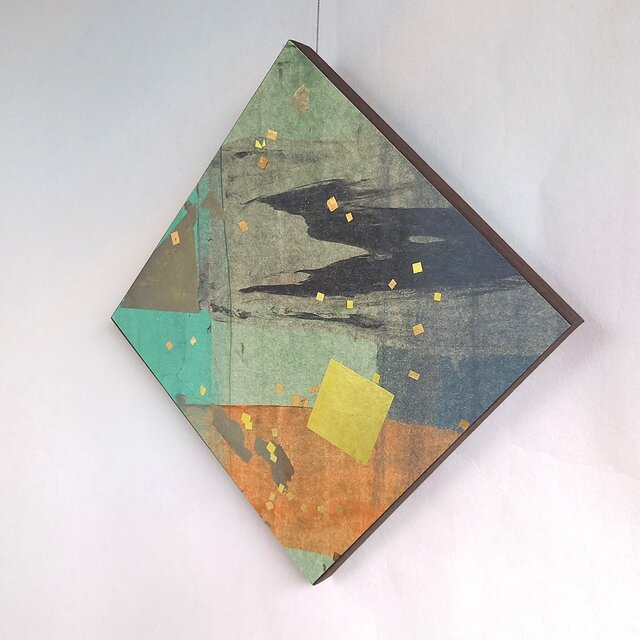 【商品説明】壁飾り【テーマ】菱形に飾る。加飾の偶然性の黒い影を箔細工で整える。【加飾】色を重ねた加飾紙の偶然を地に箔細工、七彩箔(クローム)と和光箔。【サイズ】200角-18㎜ 129g【特徴】再制作は難しいです。【注意】紙製品ですので水濡れなどご注意ください。