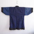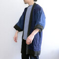 ボディと袖、異なる縞生地を組み合わせたこの野良着は、