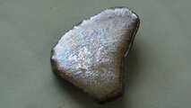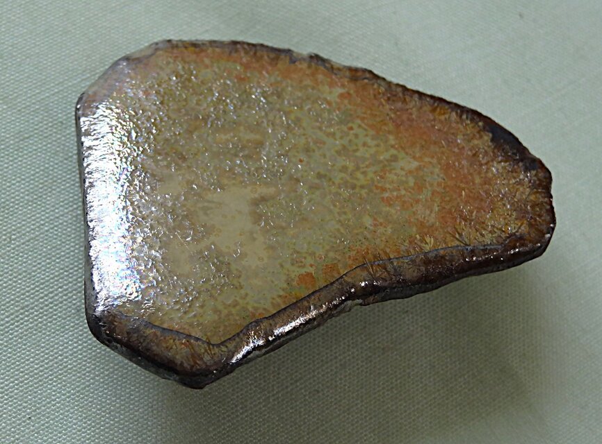 本作はブローチです。鉄分を用いらラスター釉で光彩釉とも称します(自作)光の当たり方で反射の表情が変わります。(4と5の写真)素地土は鉄を微量含むもの使い、この成分の影響で、複雑な呈色となっております。もちろん世界で唯一。