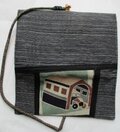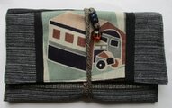 蓋の上に、レトロな車が車庫の中に入っている絵柄の、子供の着物を張り付け、正絹の羽二重の黒の着物で作ったバイアスで留めています。