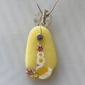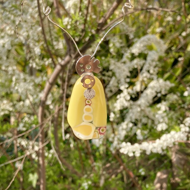 パステルカラーの黄色に、歯車のような、小花のような小さなモザイクガラスを並べて作ったガラスは、パーツごとに、バーナーワークで成形したのち、電気炉で1枚の板状に成形しています。