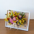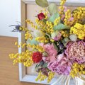 *こちらのアレンジは、ドライフラワーを使い制作しています。ドライフラワーは、非常にデリケートな素材です。お取り扱いは、優しく丁寧にお願い致します。ドライフラワーは、概ね半年程で退色が始まります。早いものでは、1~2カ月で退色する物もあります。これも自然の移ろいとご理解頂き、時間の経過と共にアンティーク調に変化して行くその経過もお楽しみ頂ければ嬉しいです。高温多湿・直射日光・ドア等の衝撃を避けた、風通しの良い室内に飾ってお楽しみ下さい。お好みにもよりますが、ドライフラワーは1年程がお取替え時期になります