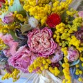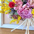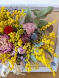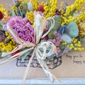 花材:ユーカリ、ミモザ、シャクヤク、スターチス、ラグラス、エリンジューム他…