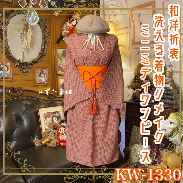 【 単衣着物リメイク ミニミディ ワンピース/ドレス/洗える化繊 帯サッシュベルト 茜 × 垂直の竹林 KW-1330】
