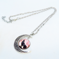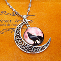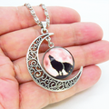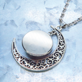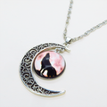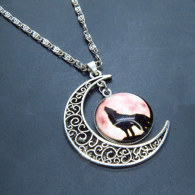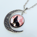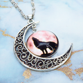 繊細なアンティークシルバーの透かし模様入りの三日月モチーフに、満月に狼のシルエットが映えるイラストをはめ込んだガラスペンダントが揺れてきらめくネックレスです