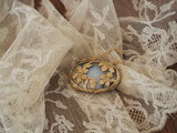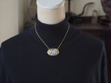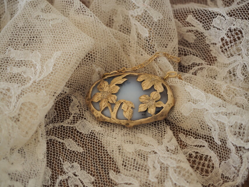次はシダ模様が少なくて寂し気だったデンドライトオパールの登場です。白い肌に仮面のゴールドが映えて見違えるように、生き生きとしています。仮面の効果が抜群!です。