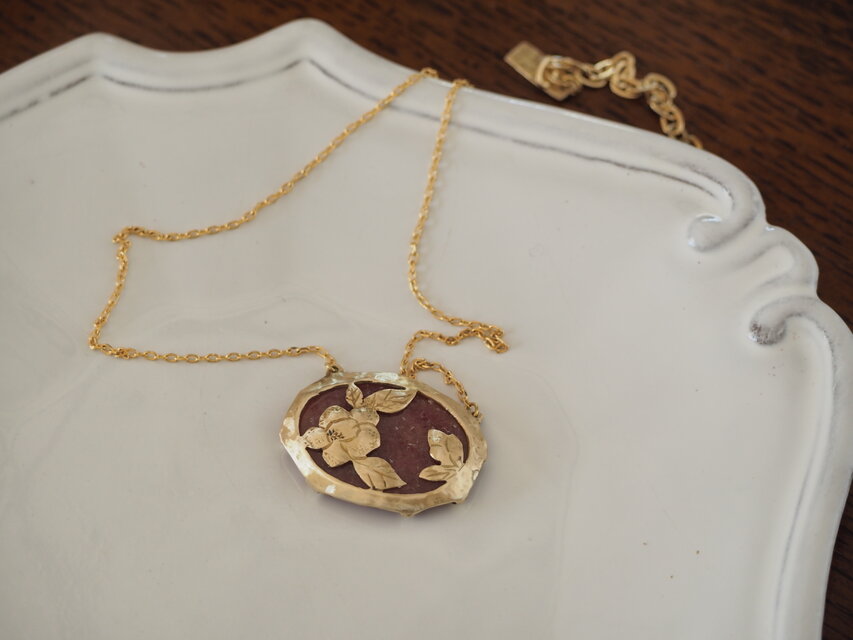 *留め具(カニカン)、チェーン、アジャスター、飾り金具、石を留めた金属はブラス(真鍮)です。