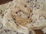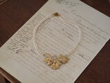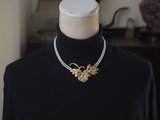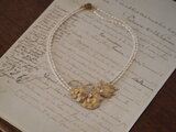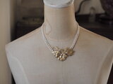 クリスマスローズ、バイモユリなど、いくつかのパーツを組み合わせて春のモチーフを作りました。合わせたのは白い淡水パールだけですが、華やかな作品が出来上がりました。見た目よりもずっと軽い付け心地です。