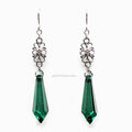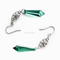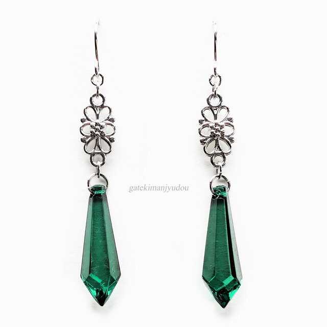 花モチーフのコネクターの下にグリーンのシャンデリアに連なっているような長めのカット入り雫型のアクリルビーズが揺れるフックピアスです。