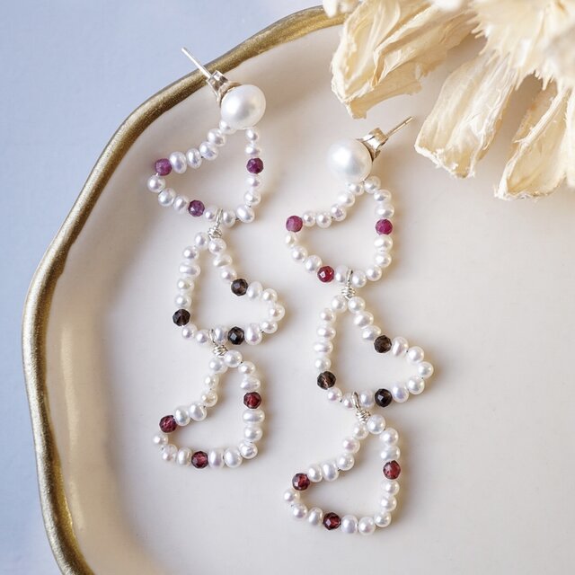 【2wayピアス】ハート 大ぶり 淡水パール 天然石 ルビー スモーキークォーツ ガーネット 春 母の日 入学式 ギフト