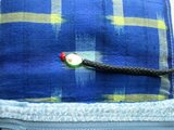 中綿を入れ、藍大島紬で作ったループを付け、ループの先に、円盤型のトンボ玉とトルコ石を付けています。