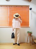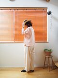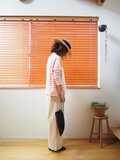 ・白やベージュのボトムと合わせて、やわらかいカラーコーデに