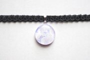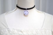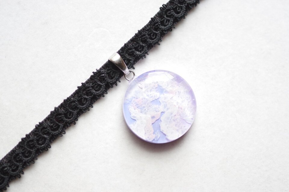 明け方のようにも黄昏のようにも見える、紫色にほのかにピンクが混じった雲に覆われた空を思わせるレジンを、ベルベットリボンにタティングレースで装飾を施したチョーカーに仕上げました。