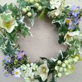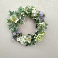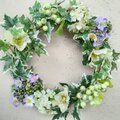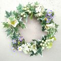 明るいグリーンのアイビーをベースにして、清楚なクリスマスローズと可憐な小花や実ものを編み込みました。淡いパープルのアリュームが、主張し過ぎない上品なアクセントとしてアイビーに溶け込んでいます。この瑞々しさあふれる爽やかなリースは、玄関やお部屋のインテリアとしても優しく馴染み、日常に彩りを添えてくれることでしょう。