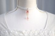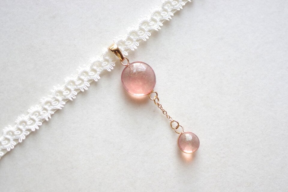 ぷっくり張りつめた大小の水滴のような透明感に魅入ってしまうレジンを、サテンリボンにタティングレースで装飾を施したチョーカーに仕上げました。