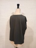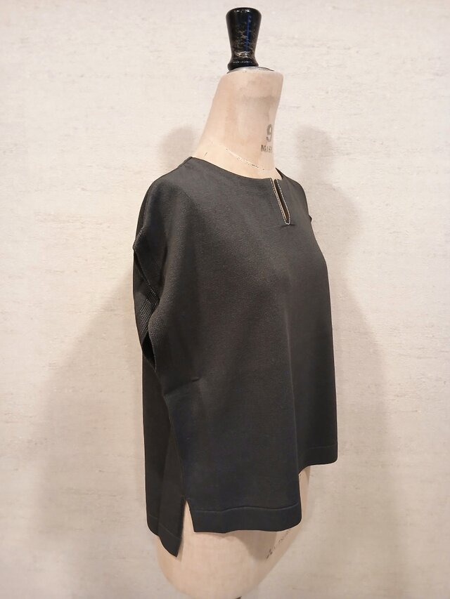 やさしく肩を包み込み、二の腕が気にならない分量です。前身頃に対し後身頃の丈を長くしてあり、両サイドにスリットを施してあります。着用時のバランスを考慮し、プルオーバーとして、使いやすくシンプルなデザインに仕立てました。