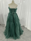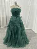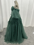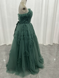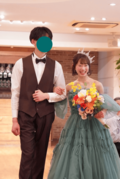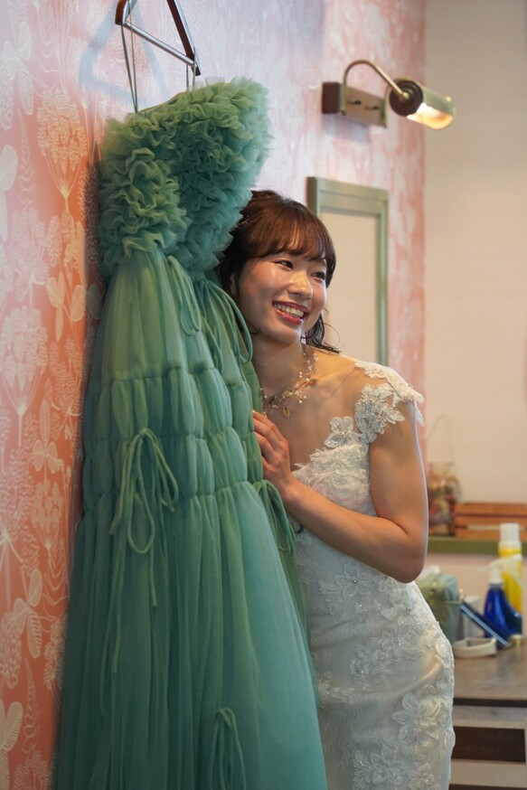 実例写真!カラードレス ミントグリーン ベアトップ 取り外し袖 ロング ラッフルフリル リボン 花嫁