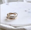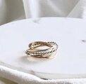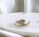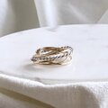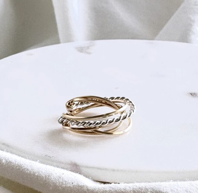 ゴールドの華やかさと、テクスチャーの異なるツイストされたシルバーの異素材感が魅力のリングです。