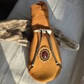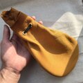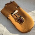 開閉は紐を絞るシンプルな構造ですが、その要となるストッパーには鹿の角を削り出して制作したパーツを使っています。