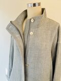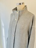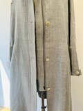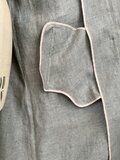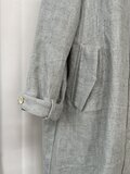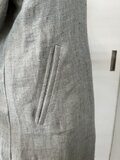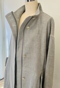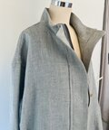 素材はベージュとミントグリーンの糸が綾織に織られたリネンを使用しています。アウターに適した適度な厚みと重みがあります。お色はベージュ寄りのミントグリーンで、他ではあまり見かけないお色です。全体的に柔らかいカラーの印象です。