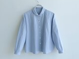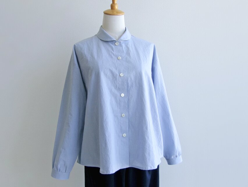 ブルーグレーのキャンブリック生地で、リラックス気分で着られる、ゆったりとしたシルエットのブラウスを作りました。