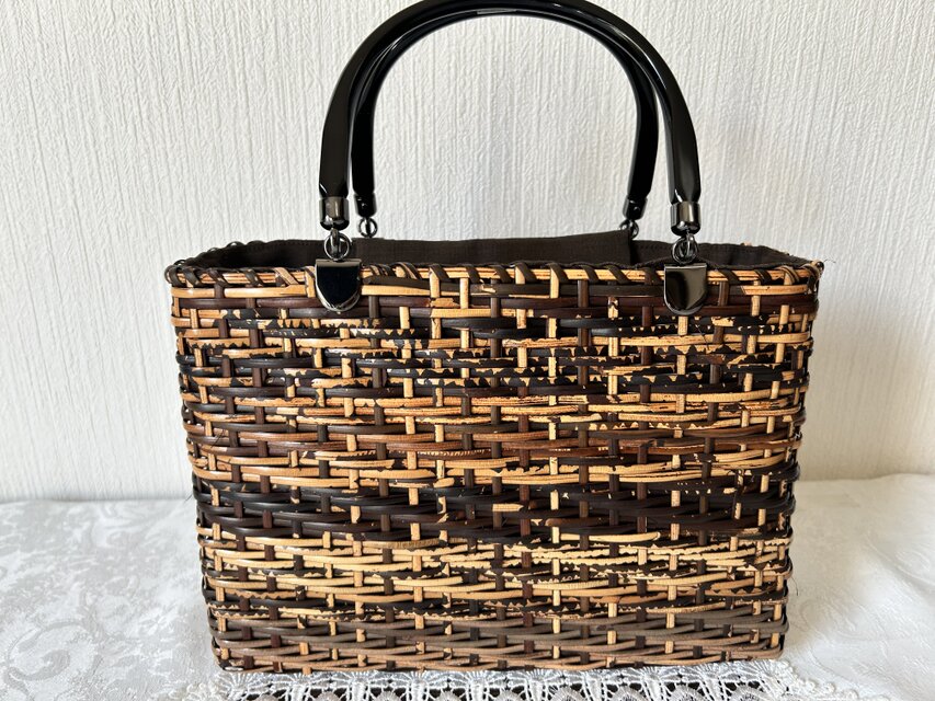籐の中でも、皮籐は高価ですが、軽いし丈夫ですので、バックに適してます。出来上がりは柔軟性もあり、物が入れやすいです。ながーく使って欲しいバックです。