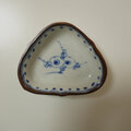 三角形の形とふっくらとした余白の中に、のびやかな線で描かれた花模様がレトロで可愛らしい小皿。どこか愛嬌のある表情を感じさせます。