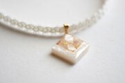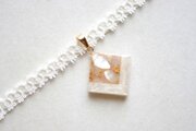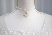 ホワイトシェルとローズクォーツのさざれを沈め、光沢のあるホワイトで囲ったレジンを、サテンリボンにタティングレースで装飾を施したチョーカーに仕上げました。
