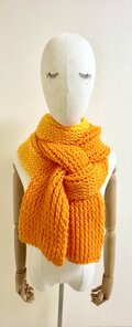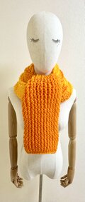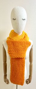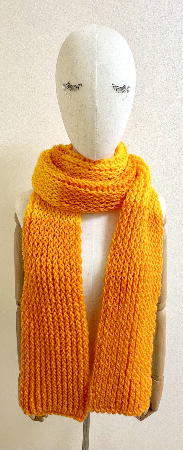 薄いオレンジと濃いオレンジで元気になるような色合いが顔まわりを明るく見せ、冬のスタイルに華やかさと温かみをプラスしてくれる一枚です。