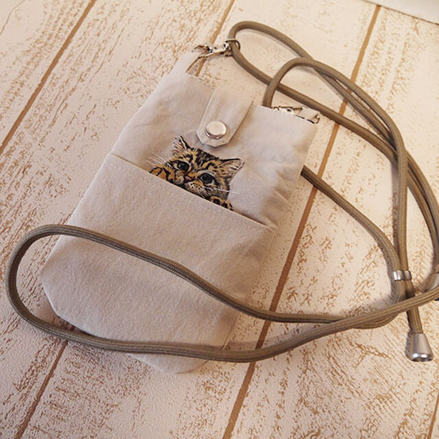 コットンリネンキャンバス生地で作ったスマホポシェット(猫ちゃん3)