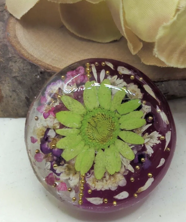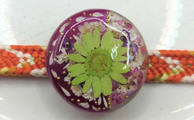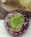 グリーンのガーベラを中心に、カスミソウなど小花を散りばめた、ボタニカルなレジンの帯留めです。