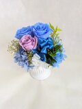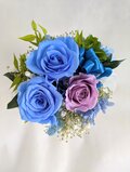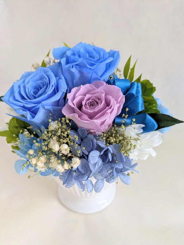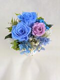プリザーブドフラワーの水色の薔薇とパープルローズを使用したフラワーギフト。薔薇の回りには紫陽花やかすみ草、グリーンを使用しています。 小ぶりなアレンジですが、ボリューム感や華やかさはちゃんとあります☆ お花には全体的に微粒子ラメ加工をお付けしていますので、キラキラとした上品な輝きがあります。 アレンジの大きさ的にもコンパクトなサイズなので、ちょっとした贈り物にもプレゼントしやすいです。ご自分用にはもちろん、お友達やお世話になった方、大切な方への贈り物に。