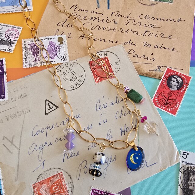 まるで小さなチャームたちが、それぞれ物語を持っているようなデザインです。