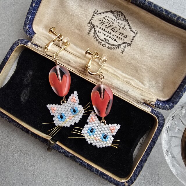 小さなビーズで丁寧に編み上げた猫モチーフが揺れるピアス