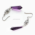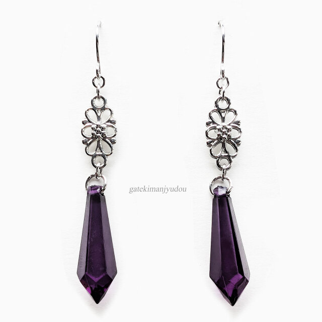 花モチーフのコネクターの下にパープルのシャンデリアに連なっているような長めのカット入り雫型のアクリルビーズが揺れるフックピアスです。