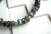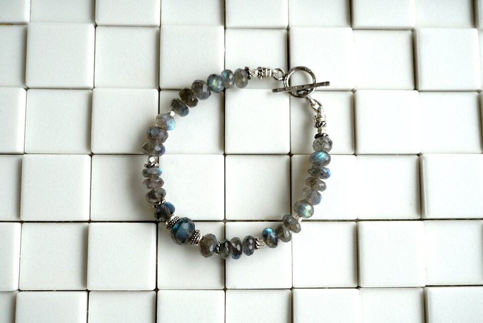 ブレスレット中央部分には一番大きい石(直径9mm程度、厚みが7mm程度)のラブラドライト(ボタンカット型)を配し、留め金部分に向かうほど石の大きさは小さくなってゆくサイズグラデーションのデザインです。